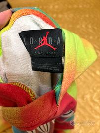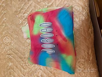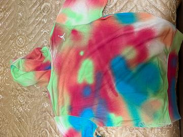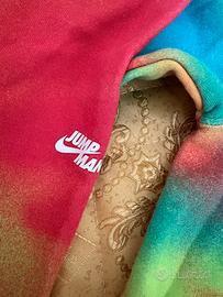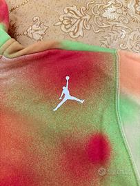 Modello hoodie con cappuccio e tasca frontale, caratterizzata da una fantasia tie-dye multicolor nei toni vivaci di rosa, verde, blu e arancione. Sul davanti presenta il logo Nike con la scritta "Jordan", per uno stile sportivo e iconico.