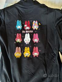 Felpa nera Liu Jeans by Liu Jo con zip taglia M, collezione "My Melody". Due tasche frontali arricciate. Sulla schiena stampa delle diverse versioni My Melody. Composizione: cotone 92%, 8% elastan. Condizioni molto buone. Misure: larghezza da ascella ad ascella cm 46, manica cm 63, spalle cm 35, lunghezza cm 57. Vestibilità scarsa per la taglia.