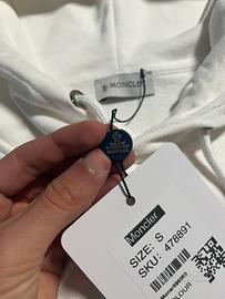 Felpa Moncler di colore bianco, taglia S, con vestibilità comoda, non slim fit e leggermente più ampia.