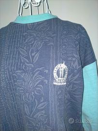 Felpa di cotone, taglia L, color blu con disegni e maniche, scollo e fascione azzurri.
