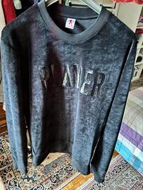 Felpa nera Bikkembergs taglia M, in ciniglia tranne i polsini, collo tondo e bordo. Scritta lucida “Player” sul davanti. 85% cotone, 15% poliestere. Misure: lunghezza cm 68, manica cm 70, spalle cm 46, larghezza da ascella ad ascella cm 53. Condizioni ottime.