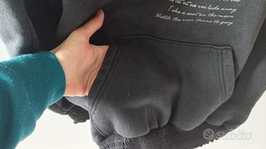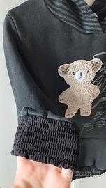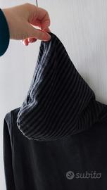 Felpa-abito nera con cappuccio (a striscie grigie) e tasca centrale. Sul fronte scritte w orsetto. Marca Blu Deise. Vestibilità comoda. Usata poco e ancora in buono stato.