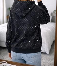 Vendo questa felpa nera con stampa stelle in taglia M 42IT, nuova senza cartellino, perfetta per un look quotidiano comodo ma di tendenza. Tessuto morbido con tasca frontale e cappuccio regolabile con coulisse, ideale per outfit casual, look a strati o giornate rilassate ✨