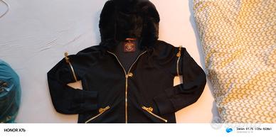 Felpa nera con cappuccio pelliccia . Zip oro. Roberto Cavalli. Maniche staccabili taglia s/m