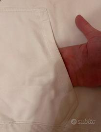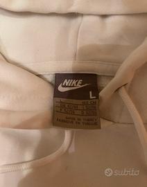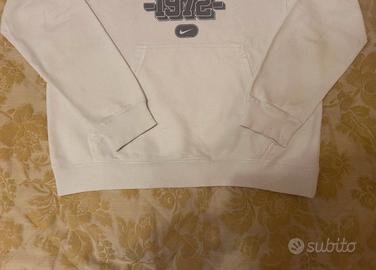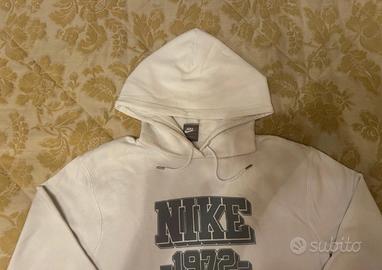 Questa felpa con cappuccio (hoodie) firmata Nike presenta un design di ispirazione retrò che celebra l'anno di fondazione dell'azienda (1972). È un capo versatile dal look collegiale e sportivo. Dettagli Estetici e Design • Colore: Un bianco sporco/panna (off-white), tonalità neutra facile da abbinare. • Grafica Frontale: Al centro del petto campeggia la scritta "NIKE - 1972 -" in stile varsity con effetto tridimensionale. I colori della stampa sono grigio scuro con contorni chiari. • Logo: Sotto la scritta principale è presente un piccolo Swoosh racchiuso in un ovale orizzontale, che richiama i loghi vintage del brand. Caratteristiche Tecniche • Modello: Felpa con cappuccio e cordini regolabili. • Tasche: Classica tasca a marsupio frontale, spaziosa e funzionale. • Taglia: L (Large), con indicazione dell'altezza ideale di 183 cm sull'etichetta. • Materiali e Produzione: Realizzata in un tessuto misto morbido (probabilmente cotone e poliestere, tipico della linea Sportswear). L'etichetta conferma la produzione "Made in Turkey". • Vestibilità: Fondo e polsini elasticizzati a costine per una migliore tenuta della forma e del calore.
