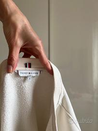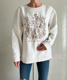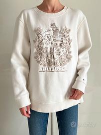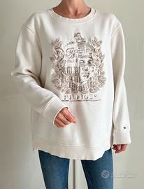Felpa oversize girocollo Tommy Hilfiger color panna, con un'iconica stampa a stemma sul davanti. - Maniche lunghe. - Orlo e polsini a costine. - Dettaglio logo sulla manica. - Misura S ma veste molto morbido come una L -Spalle 47 cm, da ascella ad ascella 58cm, lunghezza 64 cm, manica 57 cm Impeccabile