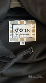 Vendo felpa SikSilk nera, taglia M, in ottime condizioni. Modello con cappuccio e tasca a marsupio, caratterizzato da dettagli sulle maniche con bande laterali a contrasto bianche e decorazioni dorate. Logo ricamato sul petto. Materiale morbido e confortevole, perfetto per un look sportivo e alla moda.