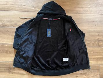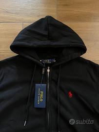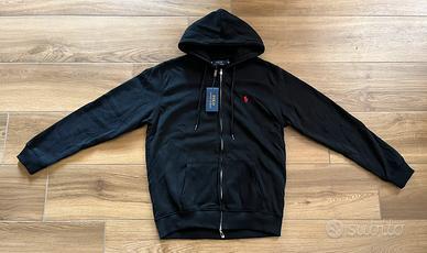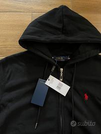Felpa con cappuccio di colore nero con cavallino cucito di colore rosso, tasche anteriori e chiusura davanti con zip Interno molto morbido e comodo in stile pile come si vede nella foto Taglia M da uomo Marca Ralph Lauren Materiale: 95% cotone 5% spandex Vendo per regalo non gradito nuova mai usata e ancora con il cartellino su come in foto