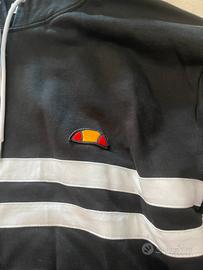 felpa nera con dettagli in bianco, ha il cappuccio, taglia XL, marca: ellesse, logo piccolo sul lato sinistro