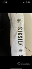 felpa sik silk con zip 1/4- taglia s Uomo. modello sportivo con collo alto e mezza zip. il capo è in ottime condizioni, usato pochissimo. • Colore: Base nera con bande laterali bianche a contrasto lungo le maniche. • Design: Logo SikSilk ricamato in oro sul petto e lettering del brand ripetuto sulle bande laterali. • Vestibilità: Taglia S (Uomo). Vestibilità regolare/slim tipica del brand. • Caratteristiche: Polsini elasticizzati e chiusura a un quarto di zip (1/4 zip) funzionale. • Condizioni: Usata ma tenuta molto bene (come da foto).