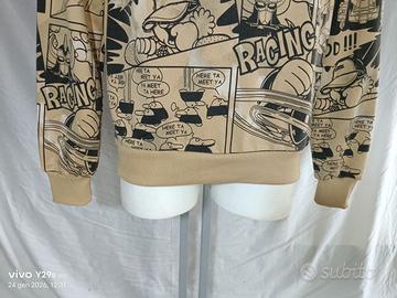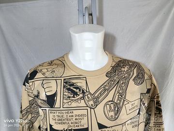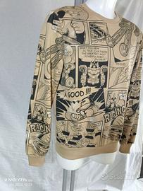 Felpa unisex, ideale per uno stile urbano e contemporaneo. Presenta una stampa all-over ispirata ai fumetti, con robot e personaggi che dona carattere e originalità al look. Scollo arrotondato, maniche lunghe e spalle basse. Bordi a costine sullo scollo, a fondo manica e in basso. per una vestibilità confortevole. Perfetta da abbinare a jeans o jogger per il tempo libero o per un outfit streetwear di tendenza. Sulla parte anteriore e sulle maniche sono presenti storie di fumetti in nero a contrasto con il fondo beige dell'intera maglia. Taglia L in eccellenti condizioni. Misure: Lunghezza 70 cm, Ascella ascella 54 cm, Spalla spalla 46 cm, Lunghezza manica 71 cm.