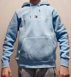 Felpa con cappuccio, colore azzurro chiaro, taglia M. Iconico design con logo Tommy Hilfiger. Ottime condizioni, ideale per un look casual. Prezzo: 40€.
