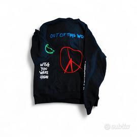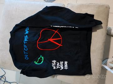 Vendo iconica felpa con cappuccio Travis Scott Astroworld World Peace, pezzo da collezione del merchandising ufficiale del tour. La felpa è di colore nero, caratterizzata dai ricami multicolore "Thrills and Chills" sul petto e il logo Astroworld sulla manica destra.