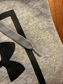 Felpa Under Armour griglia chiara, taglia M. La felpa è perfetta tranne per un solo piccolo difetto su uno dei due laccetti in cui non c'è più il gommino nero finale (come da foto). Inoltre la felpa è stata usata un po' di volte, prima di rimanere in armadio, quindi al tatto si sente che non è come nuova. Rimane comunque un ottima felpa.