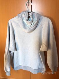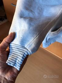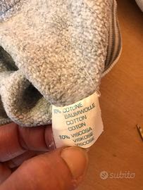 Indossata, ma ben conservata. Taglia M, colore grigio chiaro, 90% cotone, 10% viscosa. Piccolo rammendo sulla manica destra (visibile nell’ultima foto). Misure: da ascella ad ascella cm 61, lunghezza cm 60, manica a partire dall’attaccatura del cappuccio cm 61.