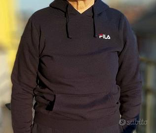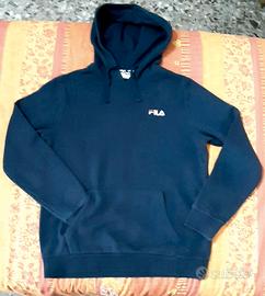 Felpa unisex Fila blu scuro con cappuccio regolabile da coulisse. Tasca sul davanti. Misura S. Composizione cotone e polyestere. Articolo praticamente nuovo.