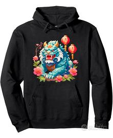 Felpa nera con stampa di Komainu (Guardiano dei santuari shintoisti e templi buddisti in Giappone). La creatura è circondata da fiori e lanterne; essa è una rappresentazione simbolica del potere e della protezione delle divinità.