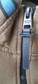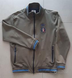 Felpa marca Aeronautica Militare 95% cotone, colore verde militare con apertura full zip, con collo rialzato. Tasche frontali chiuse da zip, polsini in tinta e bordatura azzurro-blu in costina elastica. Sul petto la stampa ricamata “Frecce Tricolori 1961”. Taglia XL. Il capo è in ottime condizioni come da foto.
