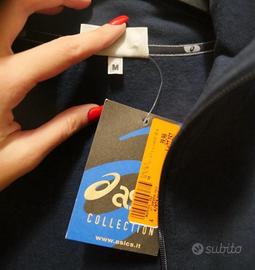 Felpa di Asics nuova con cartellino. Nessun difetto. Logo in piccolo in alto a sinistra frontalmente. Chiusura con cerniera. Colore blu scuro con inserti bianchi. Tessuto caldo e morbido. Taglia: M.