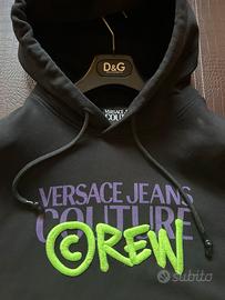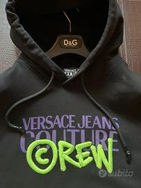 Vendesi splendida felpa con cappuccio originale Versace Jeans Couture, color nero con iconica grafica frontale. Il capo presenta il logo del brand in viola e la scritta "CREW" in rilievo verde fluo gommato/spugnato, un dettaglio di grande impatto visivo tipico della linea Couture.
