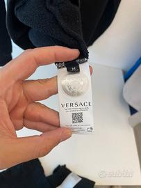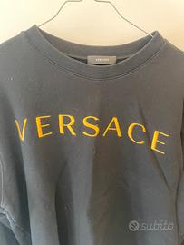 Felpa originale Versace, colore nero con iconico logo “VERSACE” ricamato in oro sul petto. Modello a girocollo, in cotone, morbida e confortevole. Perfetta per chi cerca uno stile elegante ma casual. Indossata pochissimo, in ottime condizioni. Taglia: M