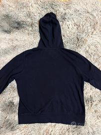 Felpa Tommy Hilfiger originale, colore scuro, con zip frontale, cappuccio e scritta HILFIGER verticale in bianco.