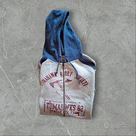 metto in vendita questa fantastica felpa con cappuccio e zip intera di Jack & Jones Vintage Denim un capo iconico e introvabile taglia XXL vestibilità comoda il design è bicolore con maniche e cappuccio blu scuro jeans e corpo color panna beige è in ottime condizioni vintage usata ma ben tenuta il tessuto è morbido caldo e confortevole la stampa frontale è grande e in rosso bordeaux con la scritta TOMAHAWK RESORT SOCIETY e TOMAHAWKS '82 APACHE TE TEAM e l'immagine di due asce/tomahawk incrociate per un look d'ispirazione americana college ha la chiusura con zip e le tasche a marsupio è un pezzo unico e si distingue non lo trovi più nei negozi è perfetta per un look casual sportivo o vintage ideale con jeans e sneakers affrettati questo pezzo vintage non durerà a lungo disponibile per spedizione immediata contattami per qualsiasi domanda