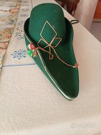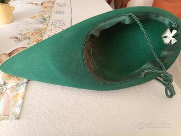 copricapo mostrato nell'immagine è unafeluca goliardica, un cappello tradizionale utilizzato nelle università italiane dagli appartenenti a ordini goliardici. Caratteristiche e Significato Il colore della feluca identifica tradizionalmente lafacoltà universitariadi appartenenza. Il coloreverdeè associato a facoltà come: Matematica e Scienze(comprese Scienze Naturali e Fisiche). Questi cappelli sono solitamente realizzati infeltro di lanae presentano decorazioni distintive come bordature dorate e simboli applicati che possono indicare l'ateneo o il percorso dello studente. Dettagli sull'Esemplare L'esemplare in foto presenta: Una struttura a punta tipica della feluca goliardica. Un'applicazione dorata sulla parte frontale che sembra riprodurre una forma geometrica o uno stemma stilizzato. Una piccola coccarda o nastro con iltricolore italianosul lato.
