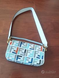 Borsa baguette colorata FENDI, realizzata in tela bianca con ricamo monogramma colorato e finiture dorate.