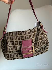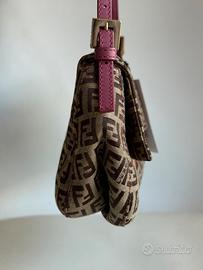 Chiusura frontale con pattina e logo Fendi, tracolla regolabile, interno foderato in tessuto con tasca.