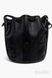 Borsa Fendi vintage originale linea Pequin, iconico modello a secchiello con chiusura a coulisse. Realizzata in tessuto Pequin nero tono su tono con dettagli in pelle e logo FF frontale in rilievo. Interno in pelle nera con targhetta dorata “FENDI S.A.S Roma – Made in Italy”.
