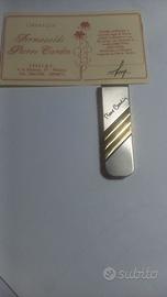 Gioiello realizzato in speciale lega di ottone rodiato e dorato in oro 23 carati con incisione a smalto della firma dello stilista . Realizzato su disegno originale di Pierre Cardin