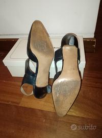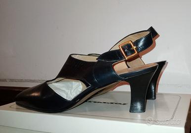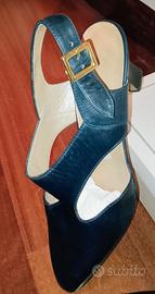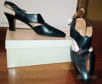 Indossate una sola volta, condizioni eccellenti. Décolleté in pelle blu notte, punta affusolata e cinturino con fibbia dorata. Linea elegante e senza tempo, qualità artigianale italiana. Interno morbido, calzata comoda, nessun segno visibile. Perfette per cerimonie, eventi o look da ufficio più raffinati.