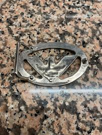 Fibbia Armani Jeans in metallo color argento anticato, con iconico logo aquila GA e scritte “Armani Jeans” incise su entrambi i lati.