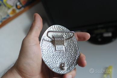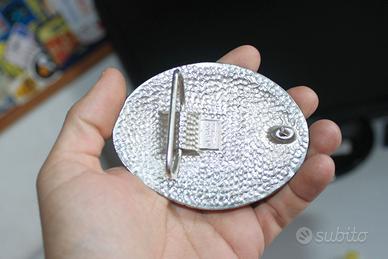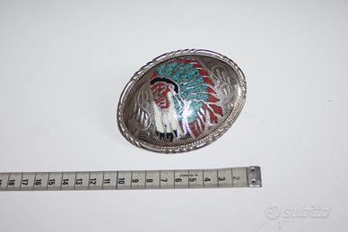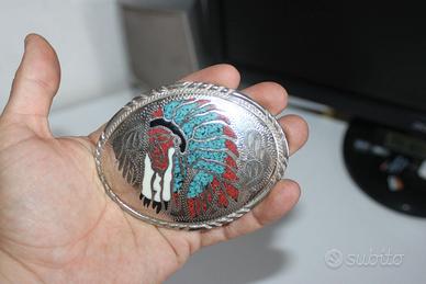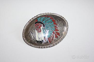 Fibbia vintage SSI artigianale argento intarsiato turchese corallo testa Indiano. Fibbia vintage usata ma in ottime condizioni come da foto, vista e piaciuta. No Resi Spedizione disponibile ma preferita consegna a mano su Genova/Chiavari. Questa è una fibbia per cintura vintage in stile nativo americano, realizzata a mano e caratterizzata da intarsi in turchese e corallo rosso. Caratteristiche del Prodotto Soggetto: Raffigura un capo indiano con copricapo di piume. Materiali: Generalmente realizzata in argento sterling o metallo argentato (spesso marcata S.S.I. sul retro) con intarsi in scaglie di pietre naturali o sintetiche. Dimensioni: I modelli standard misurano circa 10 x 7,5 cm (4" x 3") e sono adatti per cinture fino a circa 4,5 cm di larghezza.