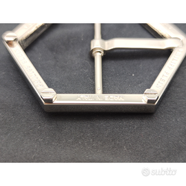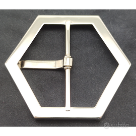Bellissima fibbia in metallo di Philipp Plein colore argento lucido dalla forma esagonale con scritte incise e viti ad esagono in rilievo. Made in Italy.