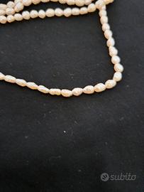 nr. 4 Fili di Perla di Fiume Ovale. Misura della perla 6-7 mm di lunghezza per 4-6 mm di larghezza Lunghezza filo 50 cm Senza alcun tipo di chiusura