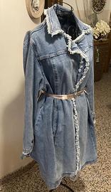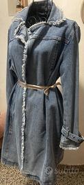Bellissimo trench in jeans per la taglia consultare le taglie di Fiorella Rubino, vedasi etichetta in foto;il nastro in raso l'ho aggiunto io. Segni in foto. Materiale denim