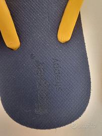 Flipper donna infradito con cinturino. Pratiche. Morbide in plastica gomma, comode. Bicolore blue gialle. Il cinturino dietro è regolabile. contrassegnata scarpa destra e scarpa sinistra. Nuove mai indossate. Misura 36.