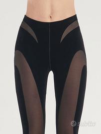 Leggings dall’effetto modellante che coniugano inserti in leggero tulle trasparente con pannelli floccati a contrasto. I dettagli opachi valorizzano le gambe con contorni che scolpiscono la silhouette. Le staffe con dettagli floccati garantiscono un look impeccabile, mentre la vita siliconata assicura una vestibilità perfetta.