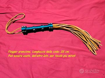 Realizzo personalmente, previa ordinazione (salvo pochi modelli che ho già a disposizione), floggers con 20 cadute, di varia lunghezza, nonchè altri manutatti in cuoio e pelle per sessioni BDSM. Per i floggers, il prezzo varia in base alla lunghezza delle cadute. Contattatemi privatamente