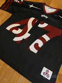 Maglia di football americano nera e bordeaux, taglia L, vestibilità comoda e morbida, realizzata in materiale resistente e traspirante, perfetta da indossare tutti i giorni o per uno stile casual streetwear, con stampe sul fronte e sulle maniche che richiamano il numero 47, nuova con cartellino, pronta da indossare subito e facile da abbinare a jeans, felpe o sneakers per un ottimo look streetwear