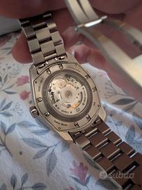 CASSA: Diametro: 39x45 Impermeabilità: 10 ATM Vetro: Zaffiro Materiale: Acciaio Colore: Blu Corona: A pressione Sistema di sospensione della cassa brevettato CALIBRO: Movimento: Sellita SW200-1 (C.O.S.C certificato) Riserva di carica: 38 h Oscillazioni: 28800 A/h BRACCIALE: Materiale: Acciaio Larghezza ansa: 20 mm Chiusura: Deployante Corredo completo. L'orologio presenta lievi graffi dati dall'uso quotidiano.