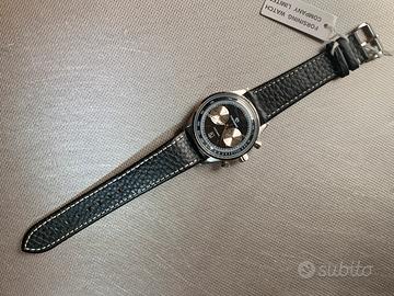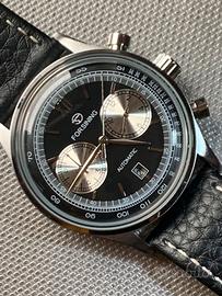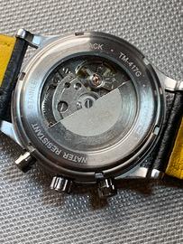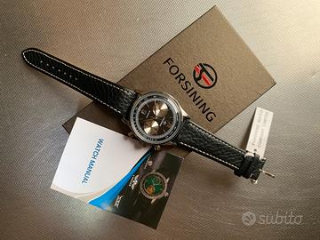 Stupendo orologio (nuovo con pellicole) FORSINNING modello Automatic di produzione contemporanea con movimento meccanico automatico visibile attraverso il vetro del fondello a vista - dotato di tutto il suo corredo originario (come visibile in foto) - cassa di 41 mm di diametro - spettacolare quadrante nero a vari livelli con indici e lancette in metallo e piccoli contatori color champagne - lunetta svasata con scala tachimetrica posta all’estremità del quadrante - vetro bombato - corona con logo - cinturino originale in pelle nera lavorata con cuciture a contrasto - orologio dall’estetica molto ricercata e dallo stile classico - ottimo rapporto qualità/prezzo