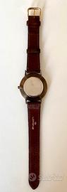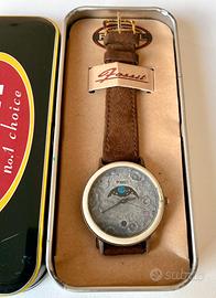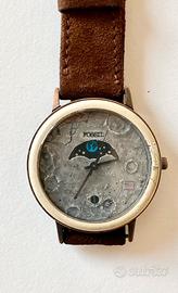 Rarissimo orologio Fossil modello MOON - LUNA (BW6726), edizione limitata prodotto in USA negli anni 90 per l'anniversario dello sbarco sulla Luna. Il quadrante di colore grigio rappresenta il suolo lunare con i crateri e la bandiera USA, la parte più interessante è la finestrella superiore dove compaiono ciclicamente il sole, la terra e le stelle; nella parte inferiore si trova il datario. La cassa è in metallo color bronzo, il quadrante in materiale ceramico color beige, il movimento è al quarzo. E'presente la scatola originale in latta. Orologio raro e molto ricercato dai collezionisti. L'orologio è complessivamente in buone condizioni, nel dettaglio: funziona perfettamente, la batteria è stata appena sostituita; la cornice del quadrante presenta sul lato destro una zona di circa 1 cm che in seguito a rottura è stata riparata (vedi foto); il cinturino è un fondo di magazzino vintage (Lorenz) in camoscio ed è stato appena sostituito. Le foto integrano la descrizione, contattatemi per ulteriori informazioni/ fotografie. Solo spedizione, ovunque. Orologi vintage anni 80 e anni 90 epoca swatch hip hop lorenz breitling omega timex hamilton bulova tissot sector fasi lunari moon landing USA space age apollo nasa armstrong ecc…