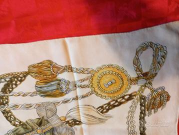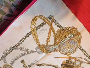 Foulard carrè Hermes donna in seta. Immagine cavaliere con pennacchio e cavallo bardato a festa. Vintage anni '60. Il foulard ha decorazioni varie e diverse, intorno alla figura centrale. Mano arrotolata (bordo arrotolato a mano). Sfondo beige chiaro, con bordo rosa tenue. Lievi imperfezioni, intorno alla scritta Hermes Paris. Cm.88x82. Il nome del foulard è "Le timbalier", designer Francoise Heron. Il cavaliere al centro,cavalca piano, perché deve avere le mani libere, per suonare il/i tamburi. Spedizione attraverso Tutto Subito.