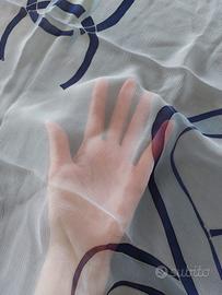 Bellissimo foulard Chanel autentico, in seta crêpe de chine leggermente trasparente (per l'effetto trasparenza si veda foto), con fondo panna, bordi blu scuro e dettagli azzurri, al centro il tipico logo delle C intrecciate, oltre alla marca per esteso in un angolo.