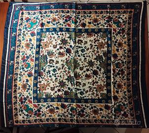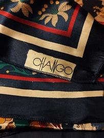 Foulard Chango con stampa floreale multicolor su fondo crema e blu, arricchito da bordi decorativi e motivi geometrici. Morbido e fluido, ideale come accessorio elegante o da indossare su borsa o capelli. In ottime condizioni.