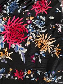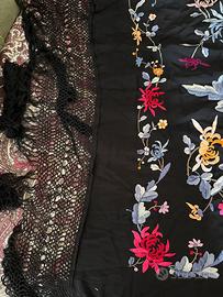 Foulard con ricamo a mano in seta di fiori rossi con frange da donna - foulard in 100% seta - ricamo a mano floreale con fiori rossi in seta - articolo usato poco, come da foto, ma ottime condizioni, tutta in seta - dimensioni indicative senza frange lunghezza 146 cm per larghezza 125cm