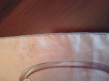 Grazioso e vecchio foulard con stampa a tema cani da caccia noto come "carre'", ed è tutto ribordato a mano, come da foto.